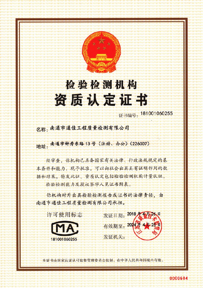 南通市通佳工程質(zhì)量檢測有限公司是于2004年11月16日依法注冊成立的第三方獨(dú)立法人檢驗(yàn)檢測機(jī)構(gòu),其前身為成立于1958年的南通市市政工程處試驗(yàn)室。